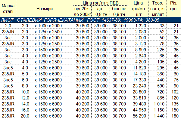 Сортамент горячекатаного листового проката производится по ГОСТу 19903-74. Вышеуказанный ГОСТ распространяется на листовой горячекатаный прокат шириной от 500 мм и более. Прокат изготавливают в листах толщиной от 0,5 до 160 мм. А так же в рулонах толщиной от 1,2 до 12 мм.