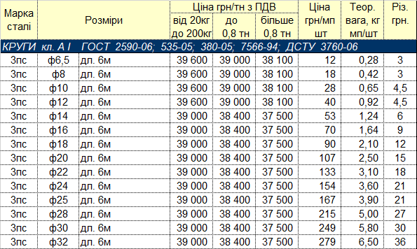 Круг сталевий, пруток гарячекатаний виготовляється згідно ДСТУ 2590 з діаметром від 8 мм. При виготовленні сталевого круга застосовується сталь 20,35,45 і 40Х, з використанням сталі марки Ст3.